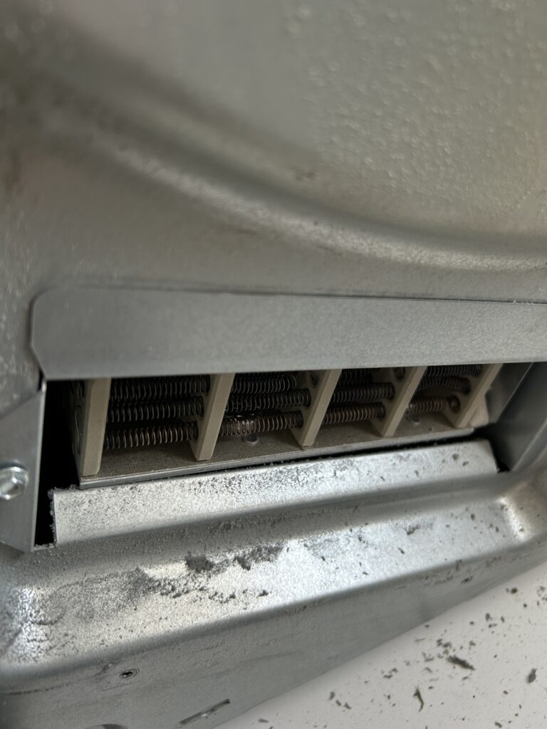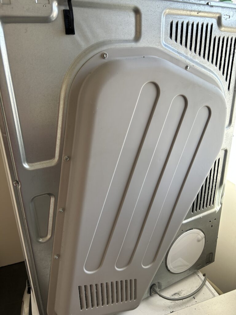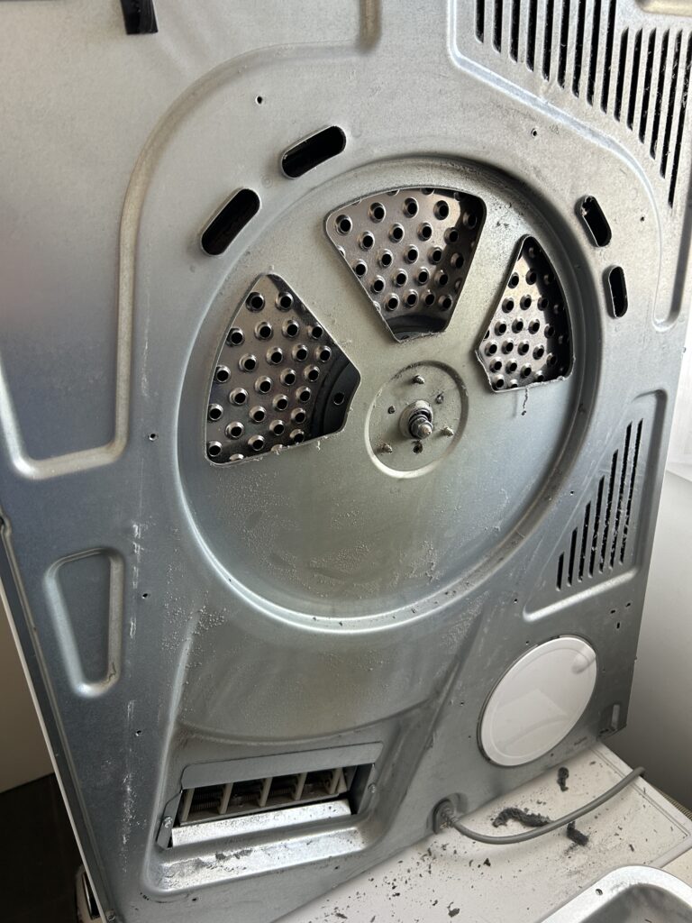 However, I hadn’t really done anything, had I? I’d just taken the back off. If I dried some things in it, it would still dry, right? So I loaded it up with socks and undies and pushed the button. After two hours I discovered that the items were colder and wetter than they’d come out of the dryer as, and that there was cold air blowing out of the vent.